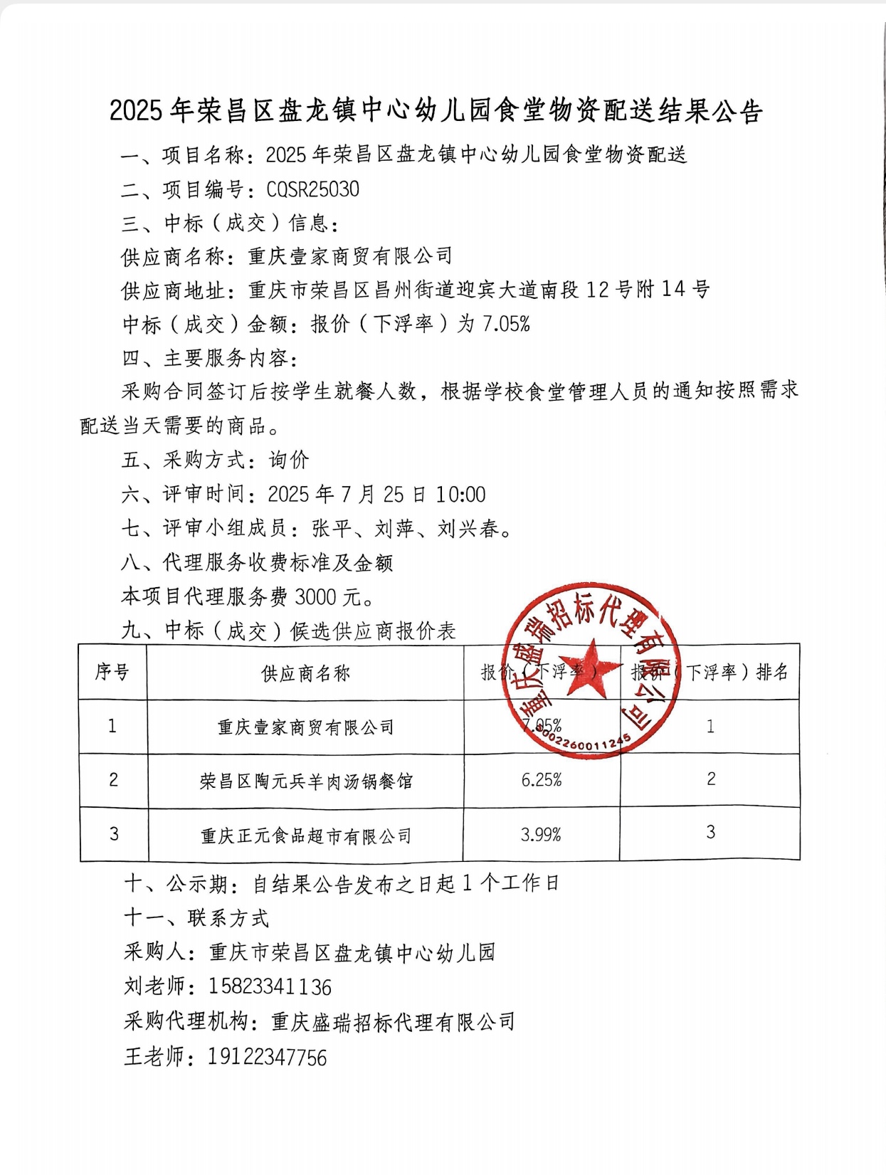 盘龙镇中心幼儿园食堂食材配送中标公示