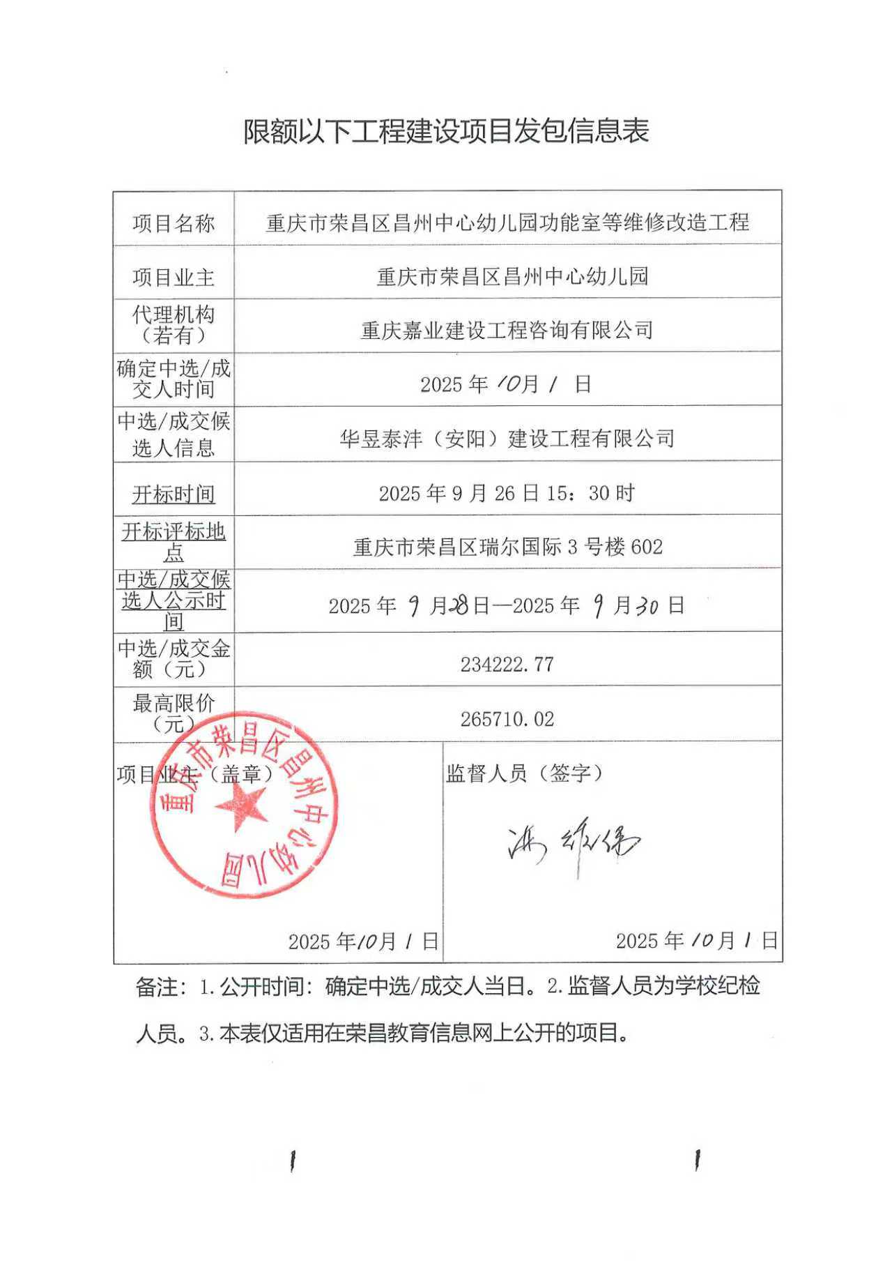荣昌区昌州中心幼儿园功能室等维修改造工程发包信息表