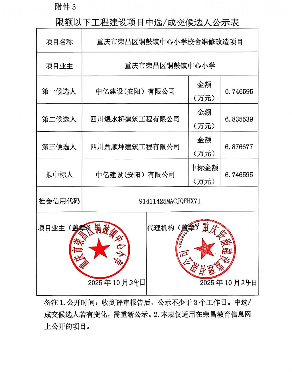 重庆市荣昌区铜鼓镇中心小学校舍维修改造项目成交候选人公示