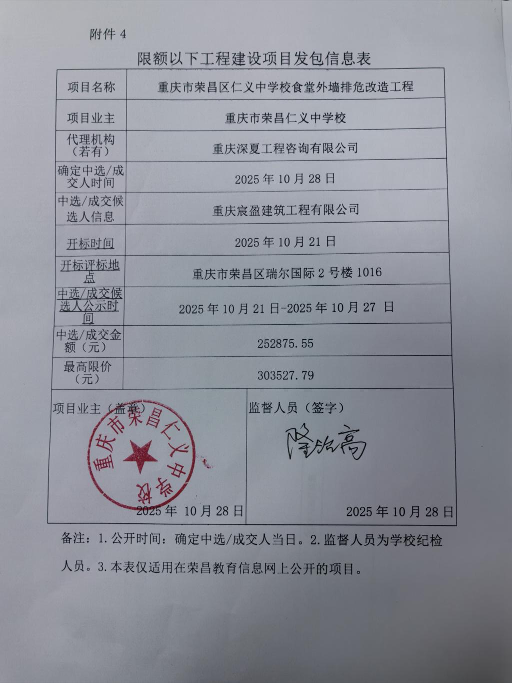 重庆市荣昌仁义中学校食堂外墙排危改造工程发包信息公示