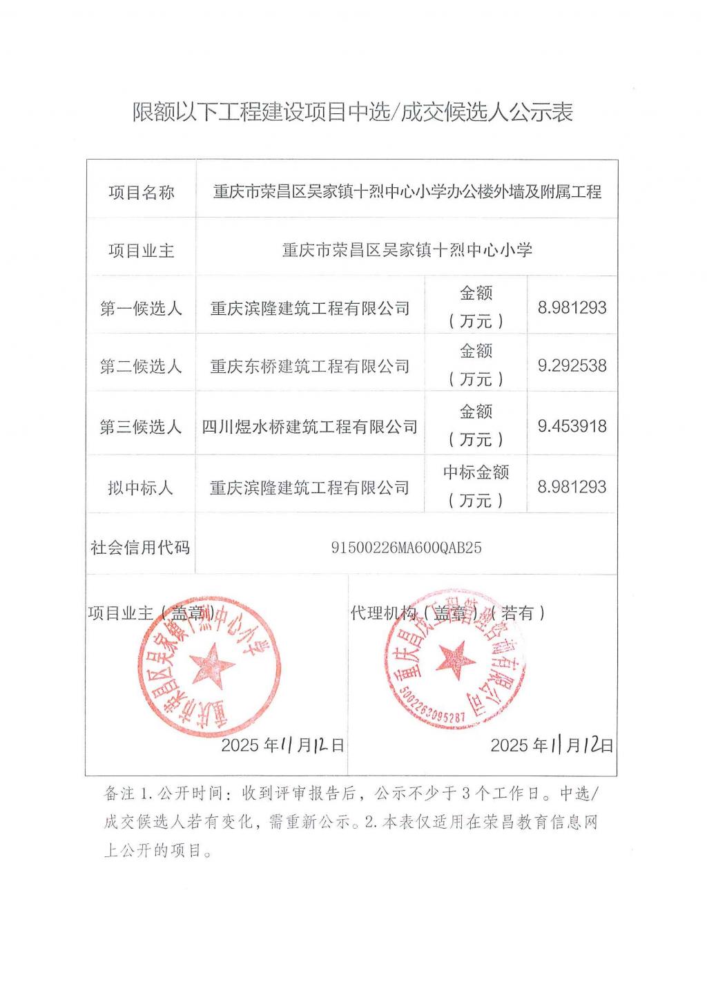 重庆市荣昌区吴家镇十烈中心小学办公楼外墙及附属工程成交候选人公示