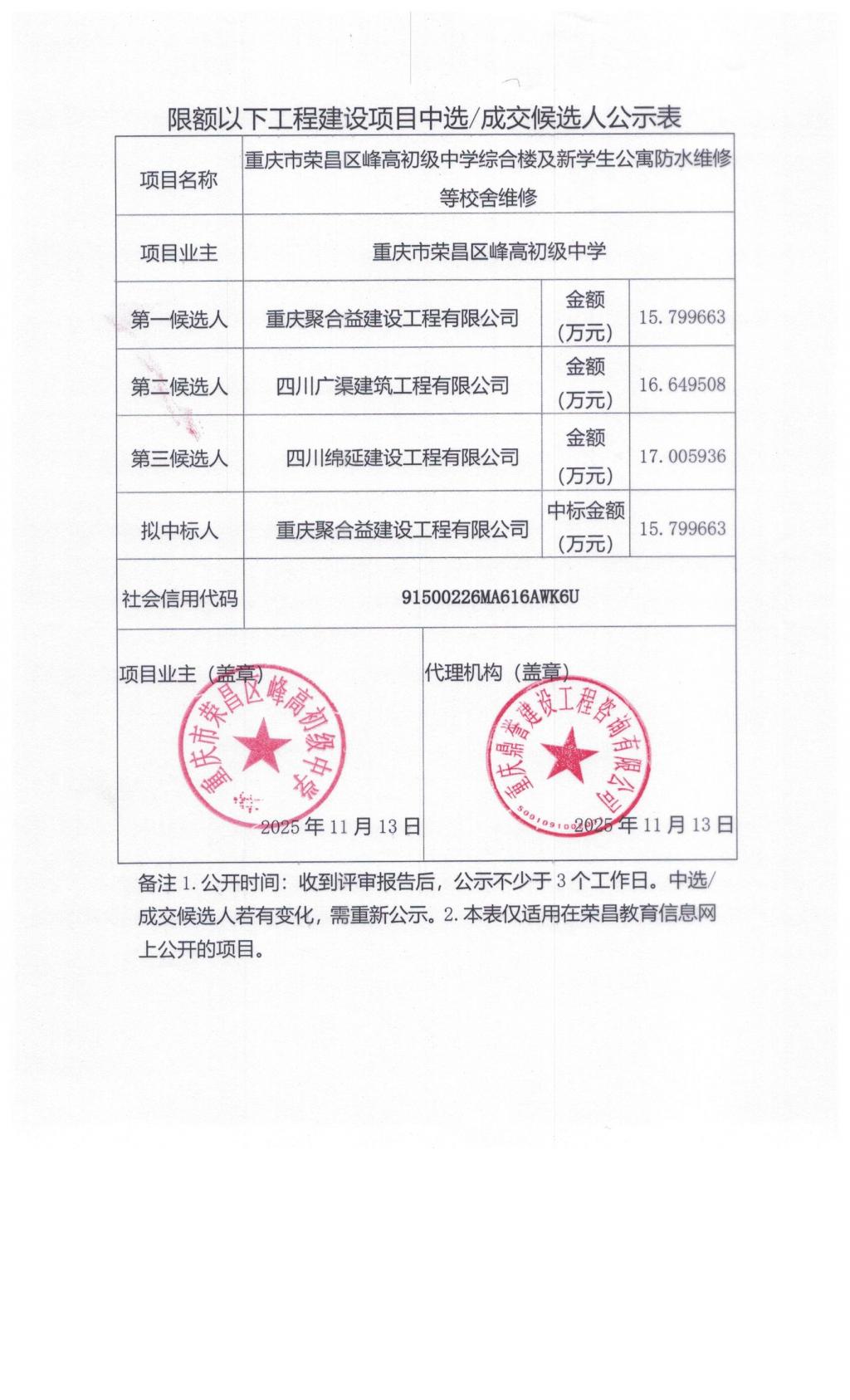 重庆市荣昌区峰高初级中学综合楼及新学生公寓防水维修等校舍维修项目成交候选人公示