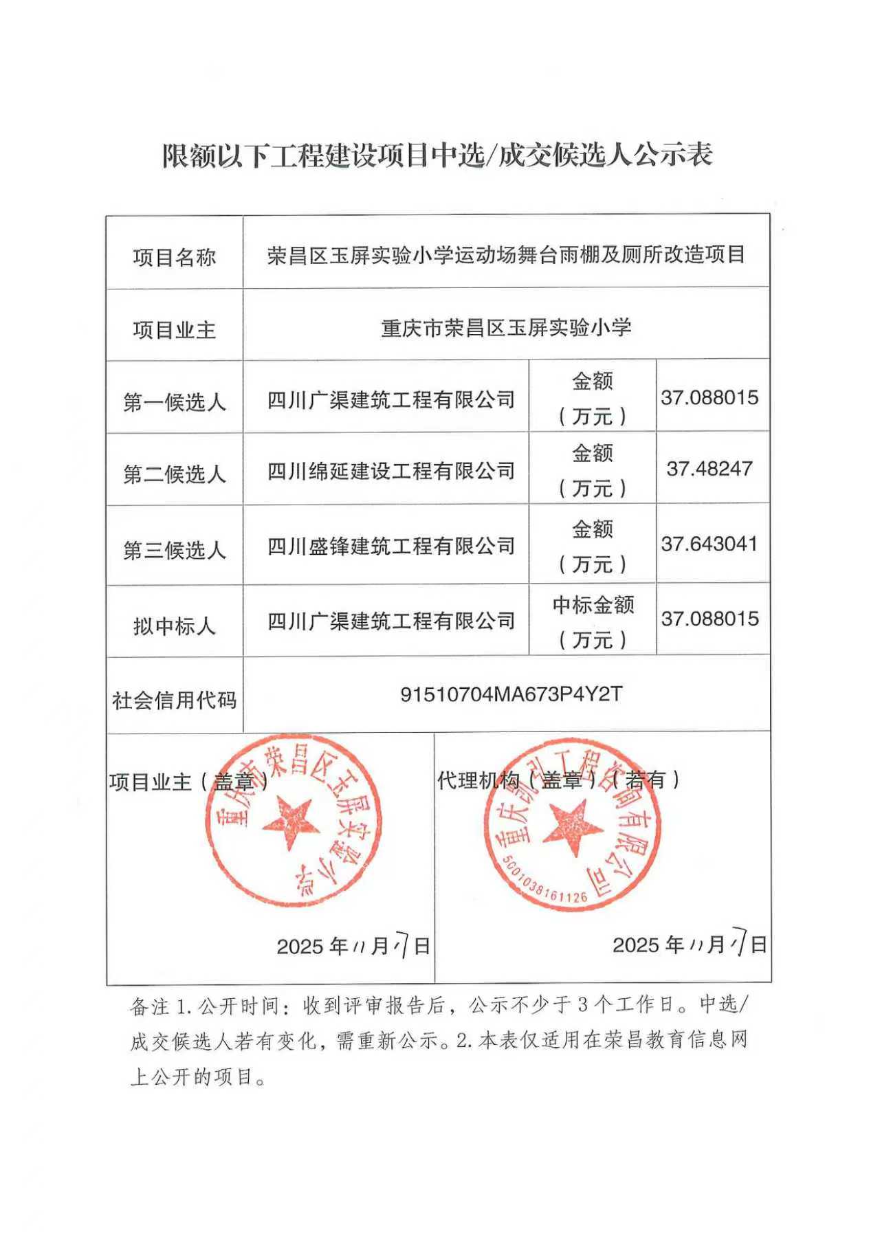 荣昌区玉屏实验小学运动场舞台雨棚及厕所改造项目成交候选人公示