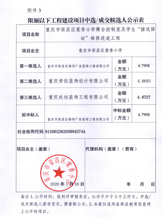 重庆市荣昌区棠香小学舞台控制室及学生“接送驿站”维修改造工程成交候选人公示