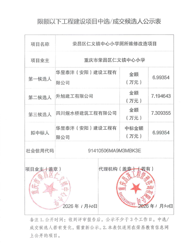 荣昌区仁义镇中心小学厕所维修改造项目成交候选人公示