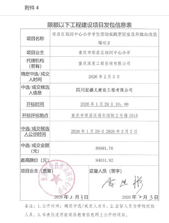 重庆市荣昌区双河中心小学学生劳动实践烹饪室及升旗台改造等项目发包信息公示