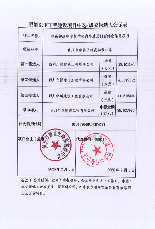 峰高初级中学教学楼内外墙及门窗排危维修项目成交候选人公示