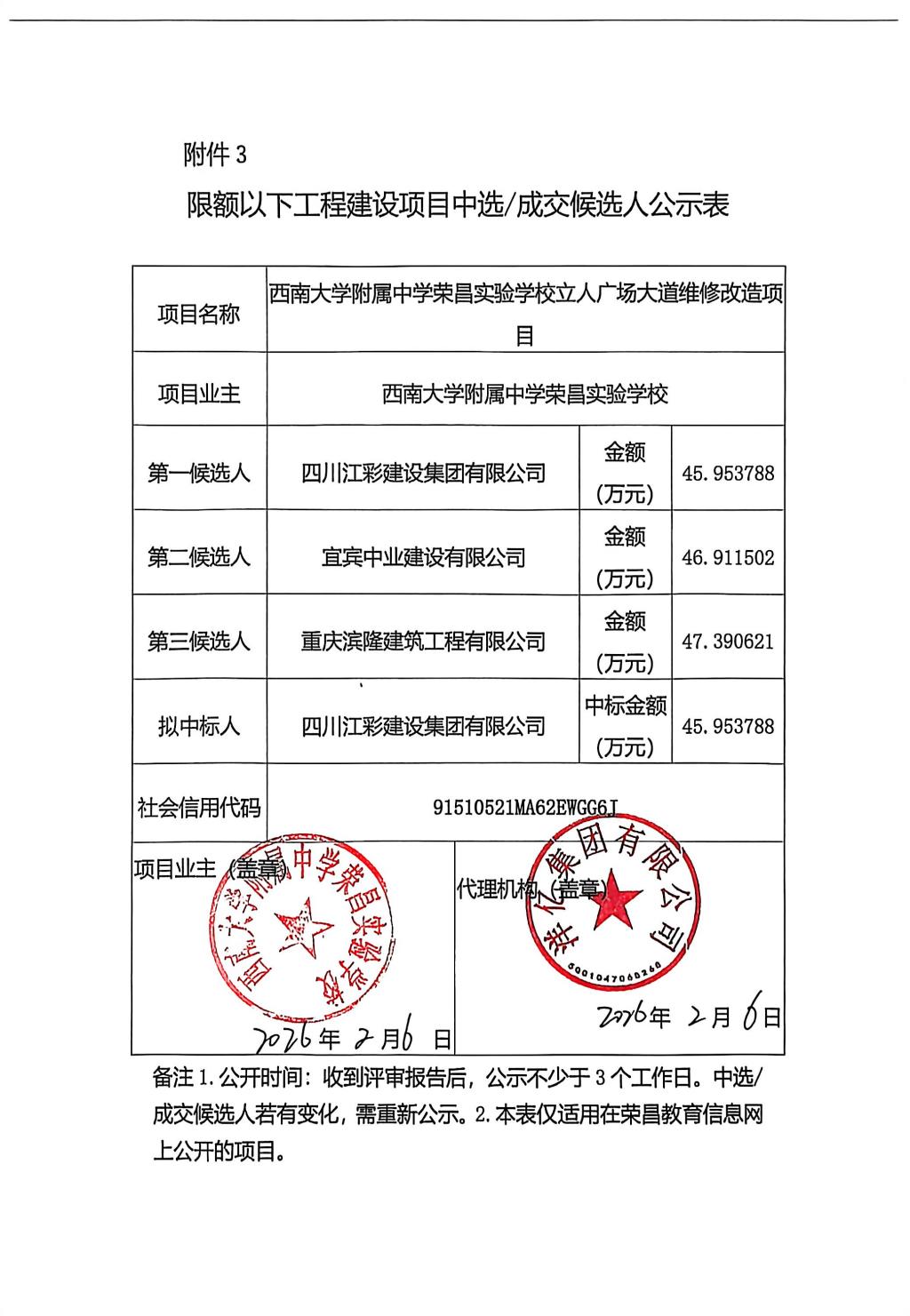 西南大学附属中学荣昌实验学校立人广场大道维修改造项目成交候选人公示