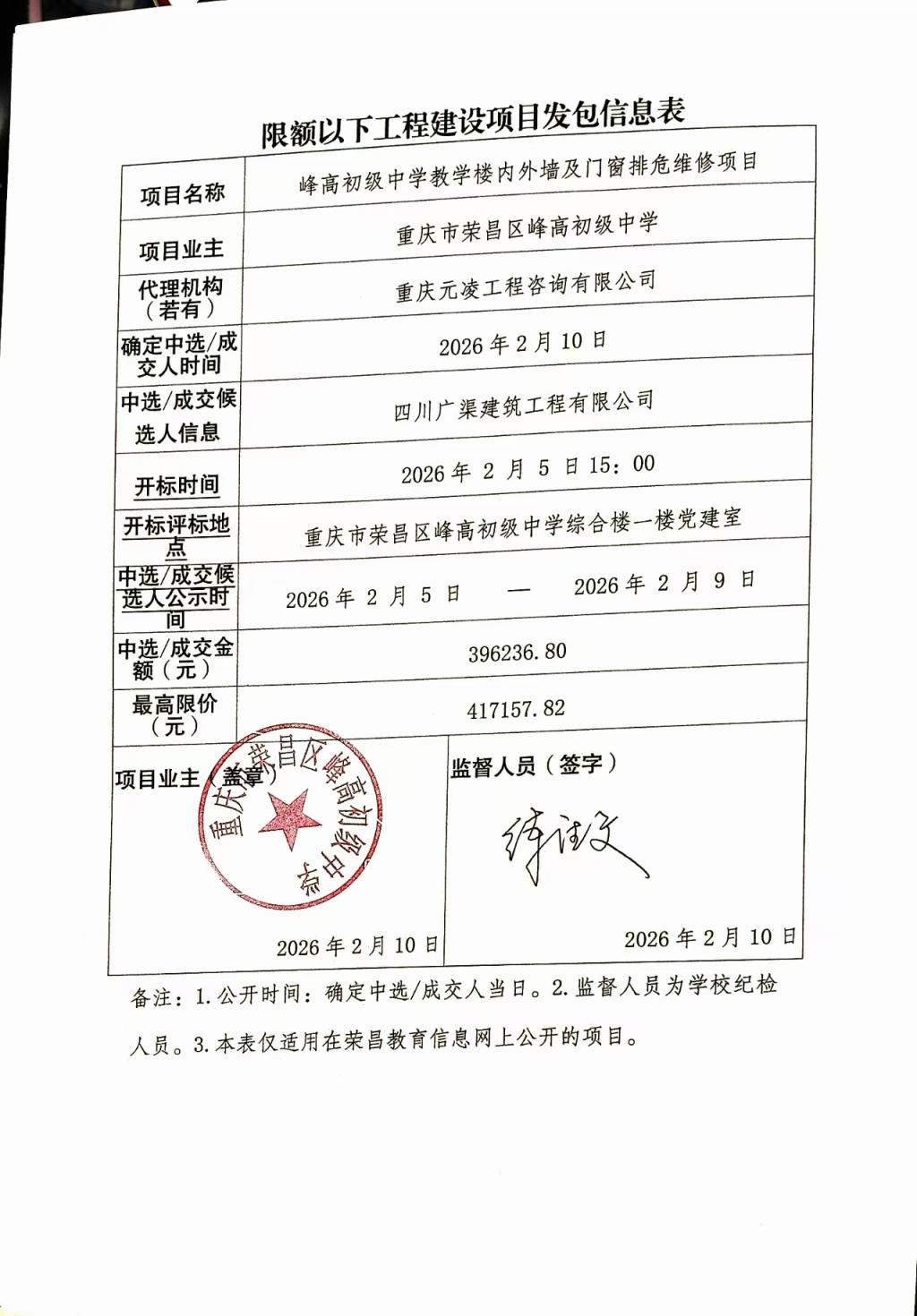 峰高初级中学教学楼内外墙及门窗排危维修项目发包信息公示