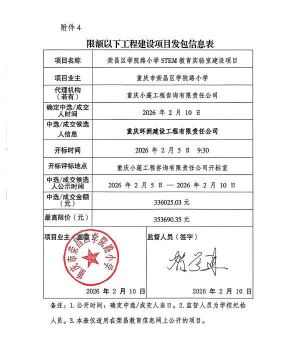 重庆市荣昌区学院路小学STEM教育实验室建设项目发包信息公示