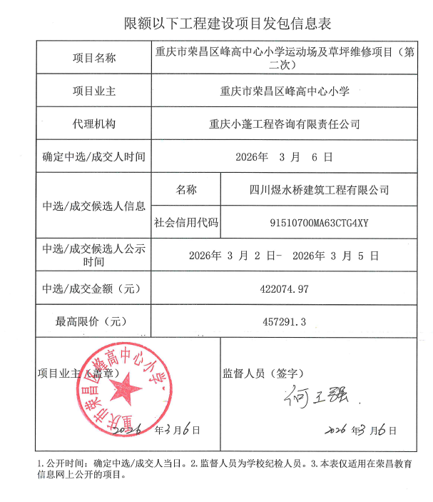 重庆市荣昌区峰高中心小学运动场及草坪维修项目(第二次)发包信息公示