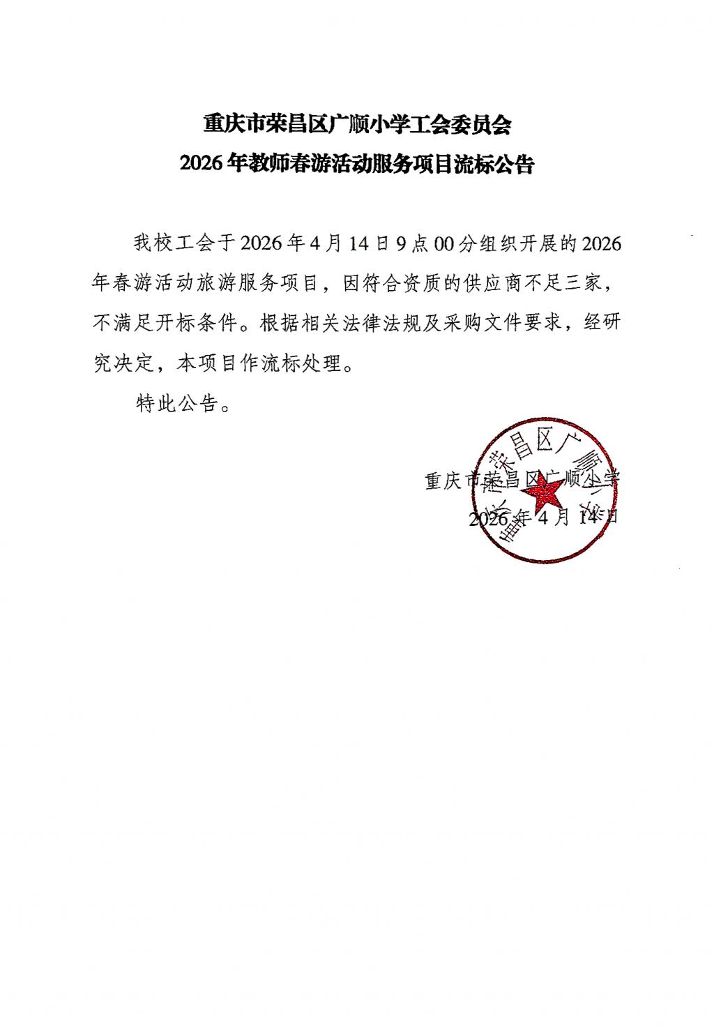 重庆市荣昌区广顺小学工会委员会 2026年教师春游活动服务项目流标公告