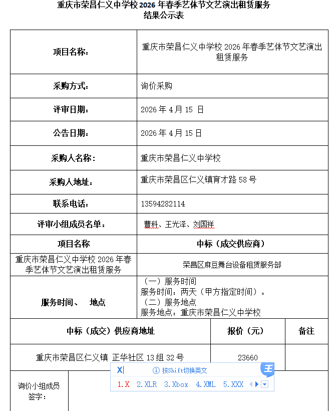 重庆市荣昌仁义中学校2026年春季艺体节文艺演出租赁服务结果公告
